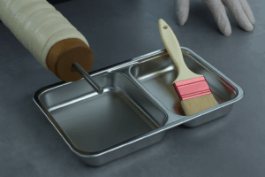 The stainless steel two-compartment oil tray is designed to help control oil usage. One compartment holds the oil, while the other keeps the brush separate to prevent it from absorbing too much oil.