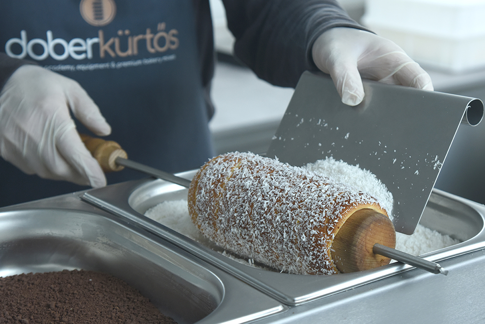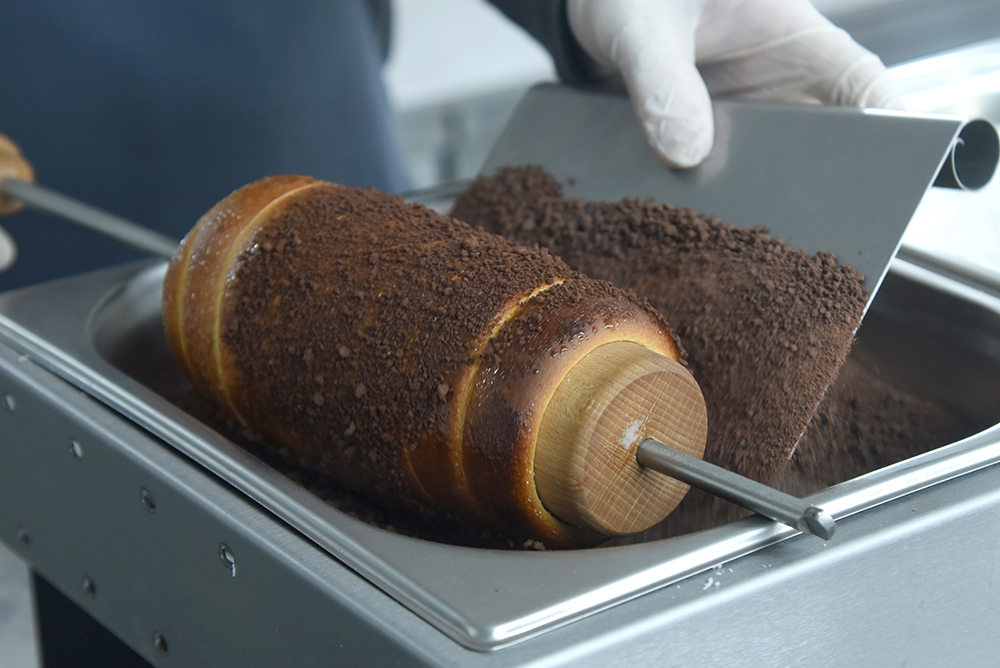 The Stainless-steel topping blade is specifically designed to apply dry toppings to the caramelised sugar coating of a freshly baked Chimney cake.