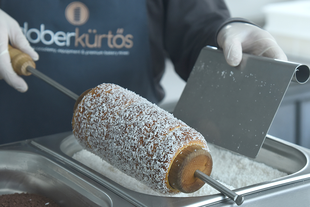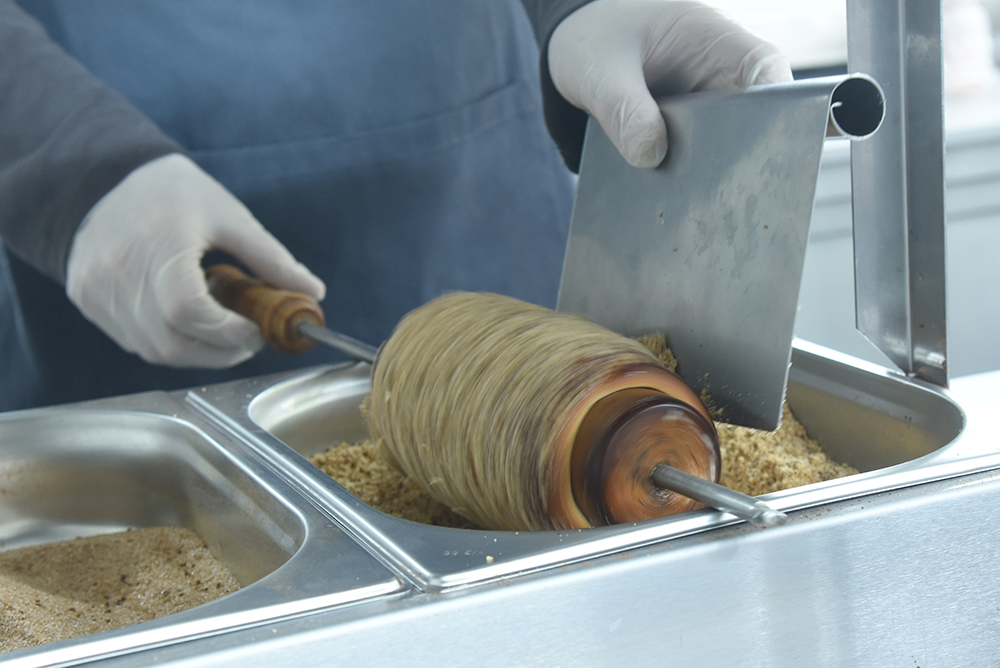 The topping blade is engineered for this exact purpose. Its length is optimised to cover the entire surface of the baked Chimney Cake, ensuring even coverage in a single motion.